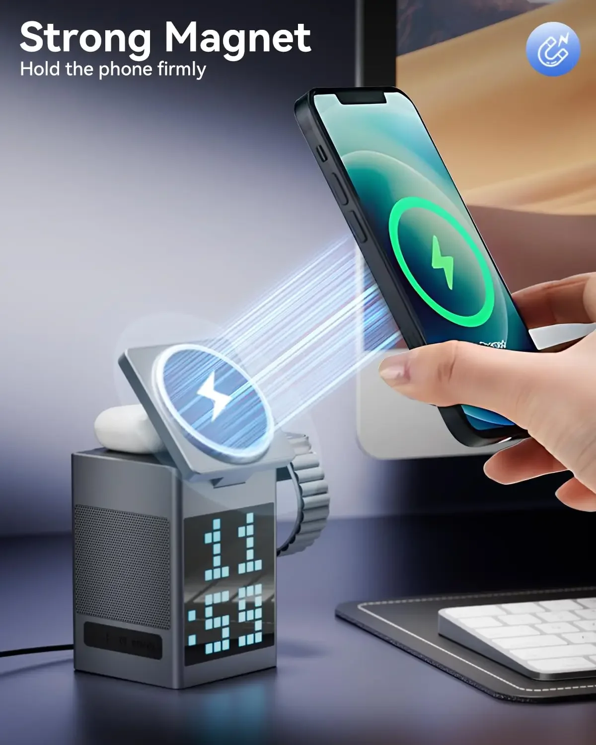 This Qi2-certified 6-in-1 wireless charging station combines fast charging, entertainment, and practicality in one sleek device: