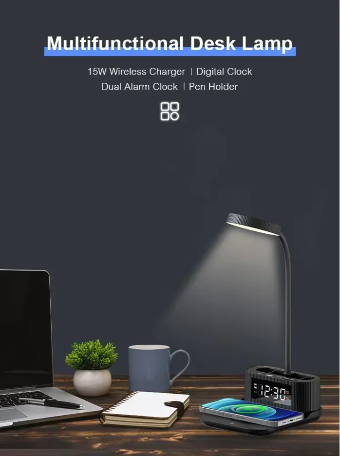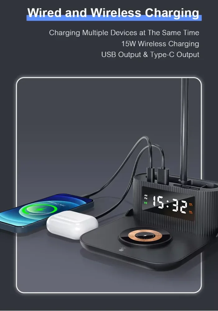 Functions: Wireless charge + clock + desk lamp + pen holder
